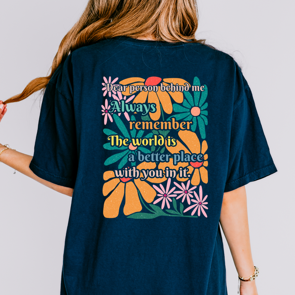 “Dear person behind me, always remember the world is a better place with you in it.” — this unisex tee is a simple yet powerful reminder of kindness, encouragement, and connection.